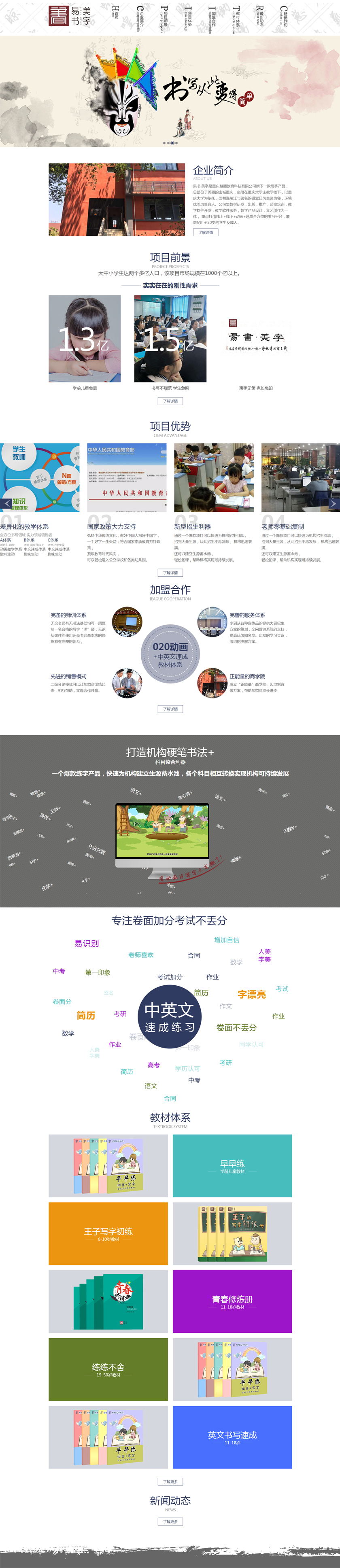 Project Description 易书.美字练字是重庆慧墨教育科技有限公司旗下一款写字产品,总部位于美丽的山城重庆,坐落 在重庆大学主教学楼下,以重庆大学为依托,面朝嘉陵江与著名的磁器口风景区为邻,环境优美 风景宜人。公司集教材研发,出版,推广,师资培训,教学软件开发,教学软件服务,教学产品 设计,文艺创作为一体,重点打造线上+线下+动画+速成全方位的书写平台,覆盖5岁至50岁的学 ... Official website address 秦皇岛# I want to share